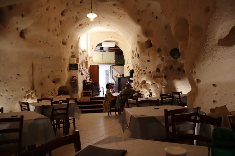 せっかくマテーラに来たのだから、サッシを利用したレストランに行ってみたい!という事で見つけたお店。ちょっと薄暗くて岩をくり抜いた感じの店内が、またいい雰囲気だと思いませんか?