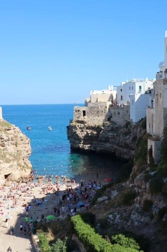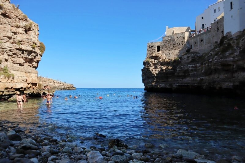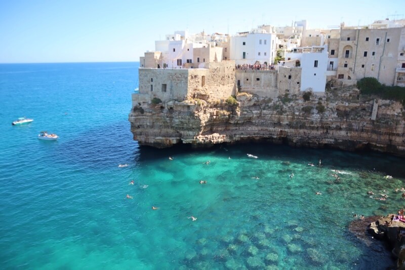アドリア海にあるポリニャーノ・ア・マーレ(Polignano a Mare)は、海岸が息をのむほど美しかった!吸い込まれるような青い海では沢山の人が泳いでいました。